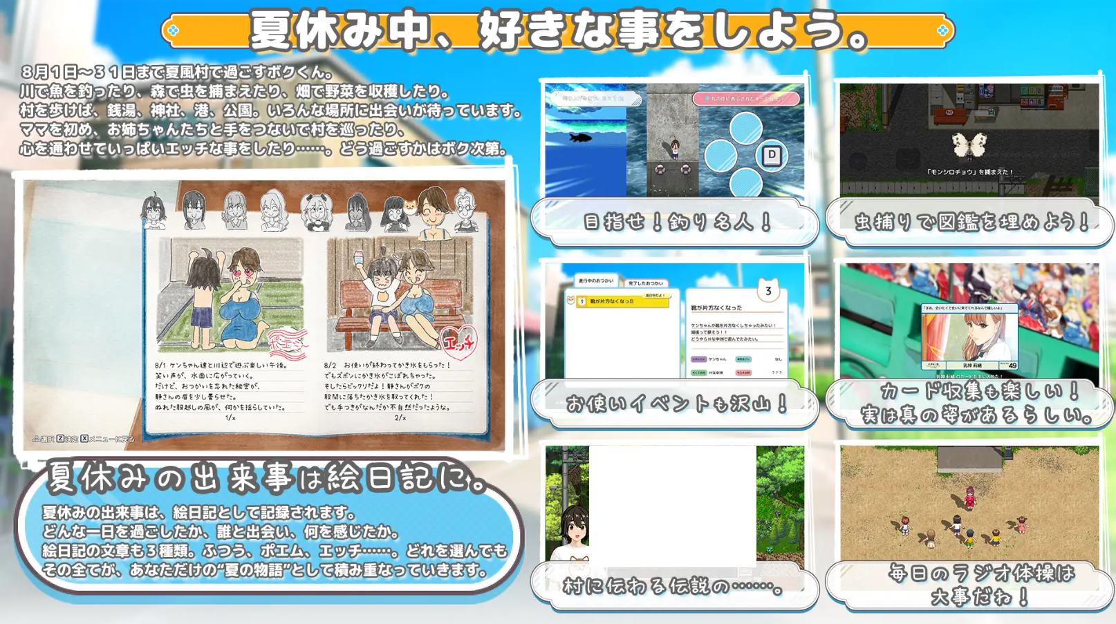 :即将出生,所以我决定去外婆家梦咲家居住的夏风村度暑假。夏风村是一个非常小的乡村,拥有广袤的田园风光、炽热的阳光、蝉鸣和其他昆虫的鸣叫,以及……那些性感迷人的成熟女性,她们都非常喜欢我。在这个名为《牵手》的暑假里,我将体验到怎样的夏日刺激和兴奋呢?当然,一切都由你来决定。