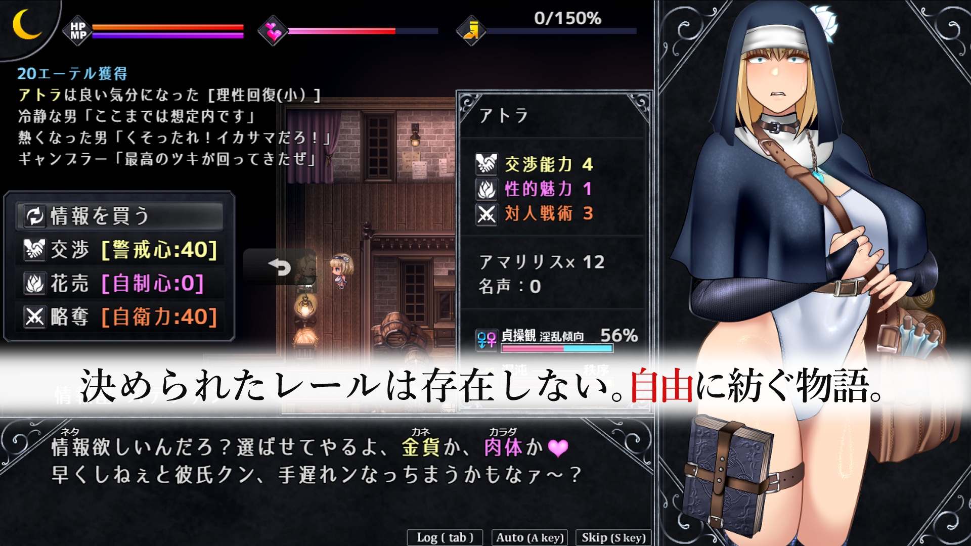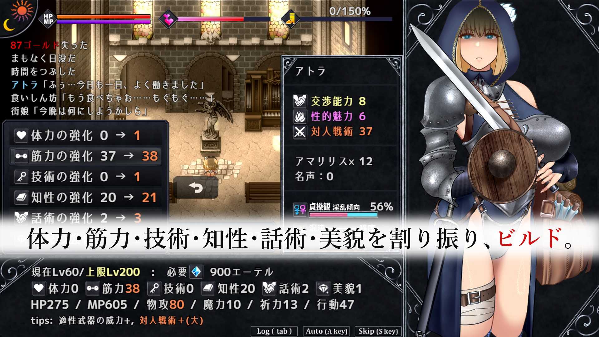 可以自由分配和培养体力、力量、技术、智力、口才、美貌等基础属性。初始选择的“出身”和三个“原初体验”会赋予“暴露癖”、“酒乱”、“后门弱点”、“受虐狂”等丰富多彩的初始能力。能力也会根据游玩倾向获得新的赋予,结合体现在立绘上的装备,可以实现诸如“后门弱点的高洁处女女骑士”或“邪恶的滥交变态修女”等广泛的角色构建和扮演。